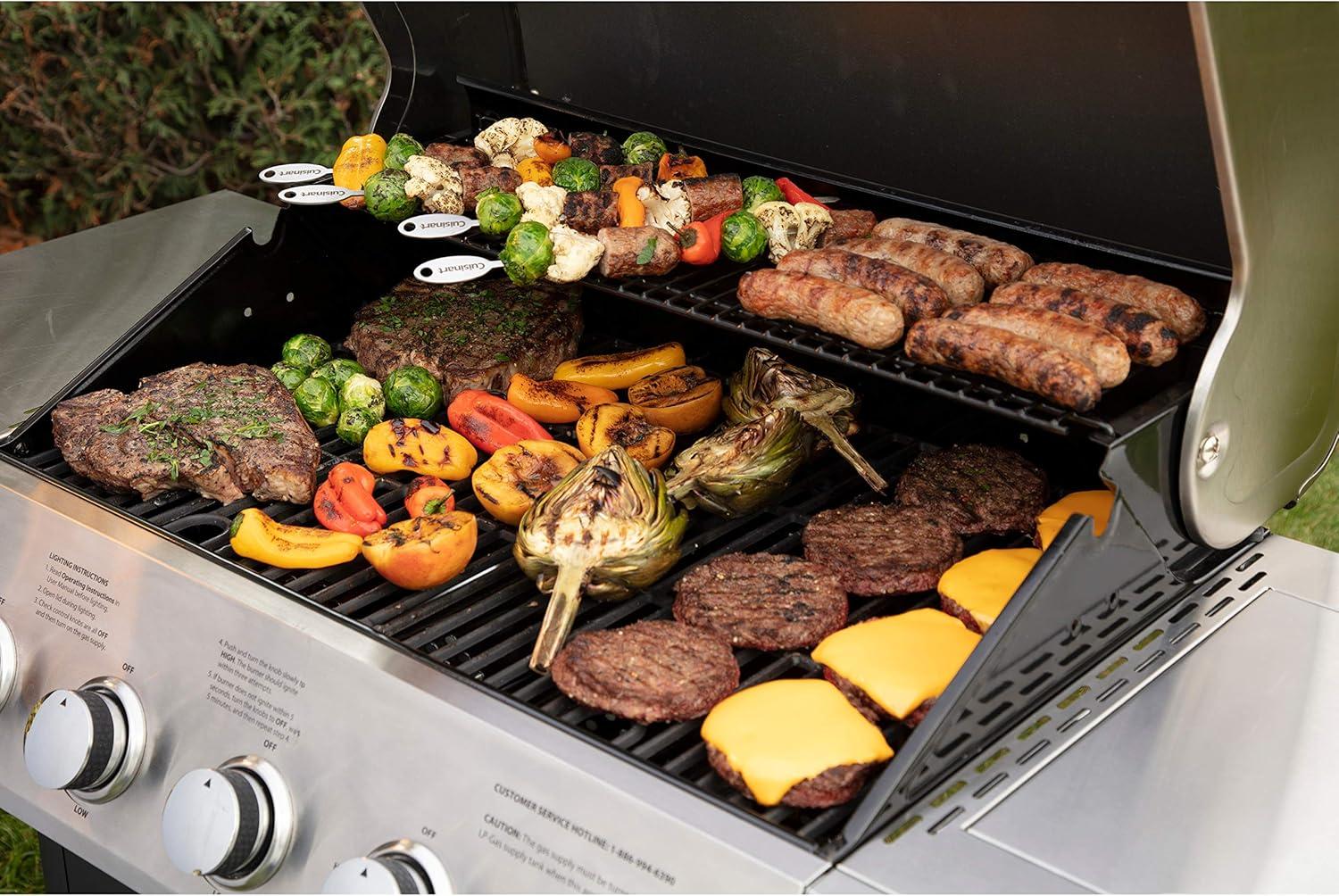 Experience powerful grilling performance with the Cuisinart 4-Burner Gas Grill, designed for backyard BBQ enthusiasts. With 44,000 BTUs of cooking power, this full-size grill delivers even heat distribution across 443 square inches of primary cooking space. Toast, melt, and warm food on a 167 square-inch warming rack. Durable cast iron grates lock in heat for bold, flavorful sears, while the stainless steel lid and control panel ensure lasting performance. Spacious side tables offer convenient prep space, making this the perfect centerpiece for your outdoor kitchen. Whether you're grilling steaks, burgers, or veggies, this 4-burner gas grill delivers the power and convenience needed for a great cookout experience.
