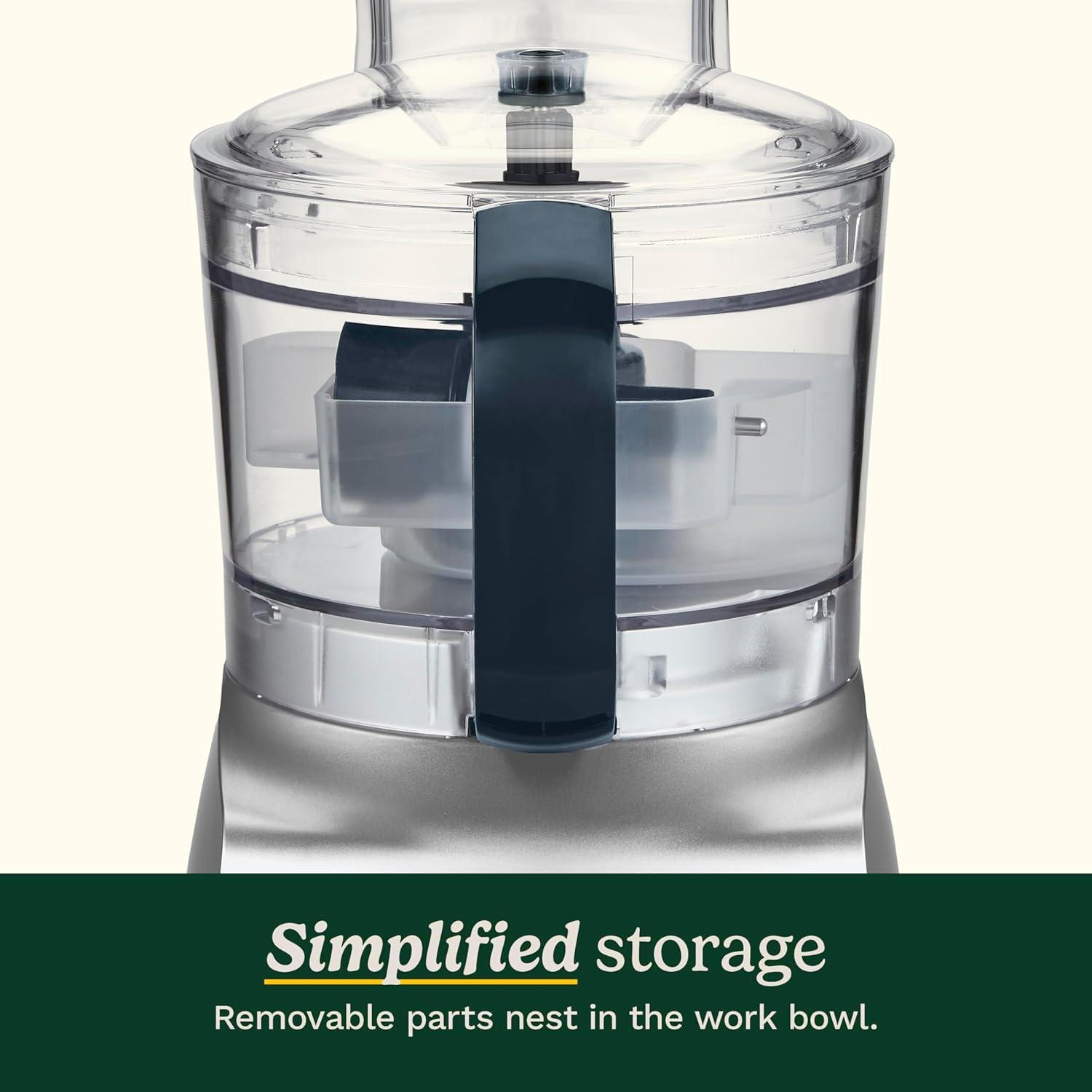 Save countertop space and simplify food prep with this multifunctional food processor that combines compact size and big performance. Power through a wide variety of food processor tasks, from chopping meats and vegetables for hearty stews to puréeing avocados for creamy guacamole. This 5-cup food processor for quick meal prep features a universal chopping blade and a reversible shredding disc to make prepping dishes, desserts, and drinks easy. Simple paddle controls put On and Off/Pulse at your fingertips, and the wide-mouth feed tube holds plenty of fruit and vegetables. To simplify storage, removable parts nest in the work bowl, and the cord goes in the back of the base.
