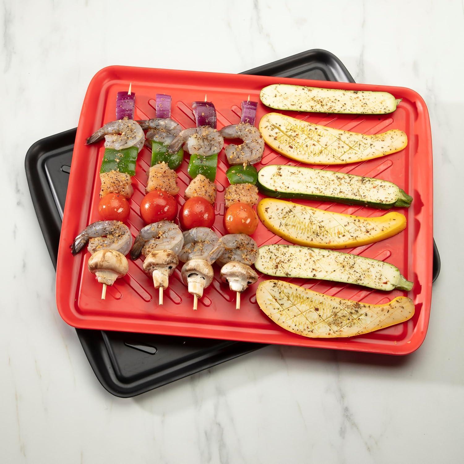 NO CROSS-CONTAMINATION: Use the red prep tray for raw meat and the black serving tray for cooked food to ensure safe food handling.